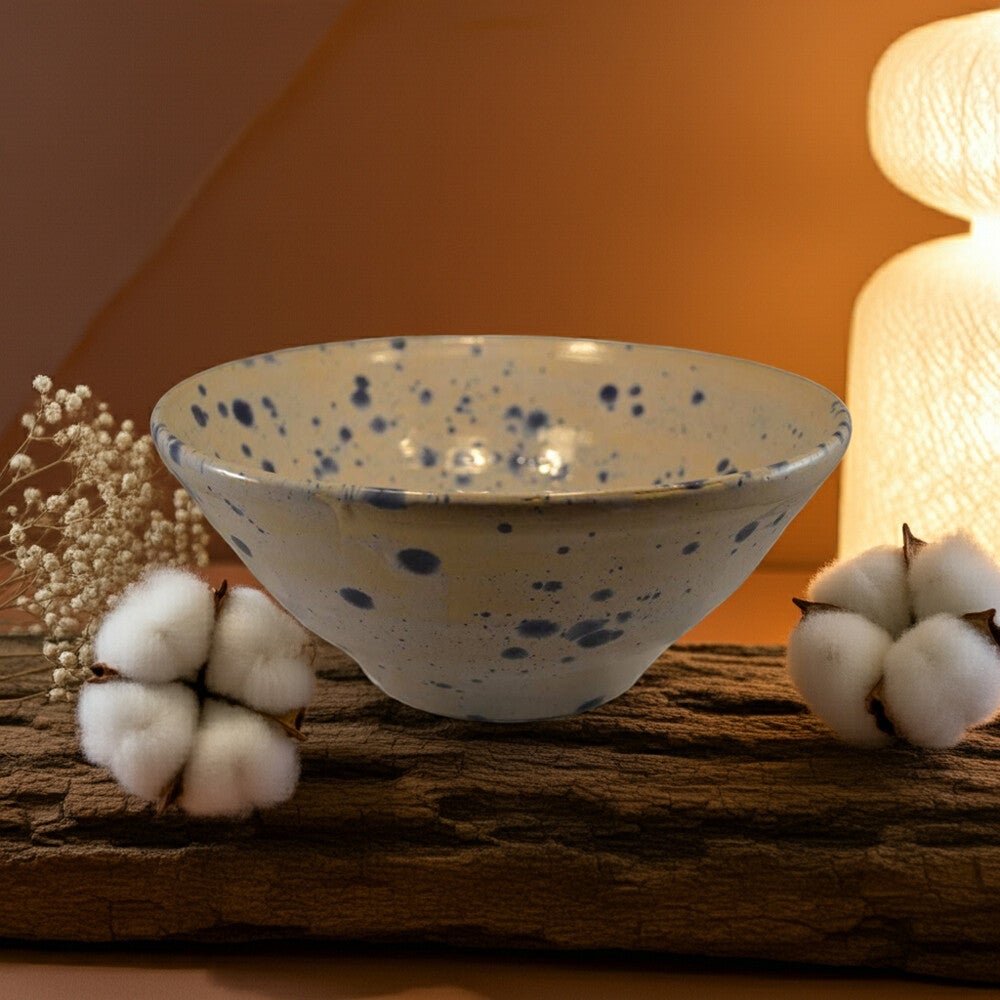 Kom afgewerkt met wit glazuur met blauwe kristallen.