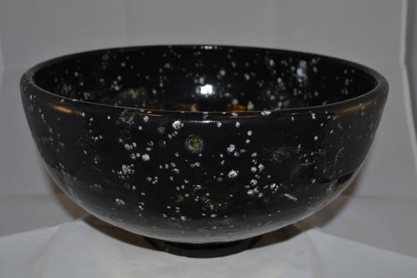 Kom geglazuurd met zwart glazuur met witte kristallen.