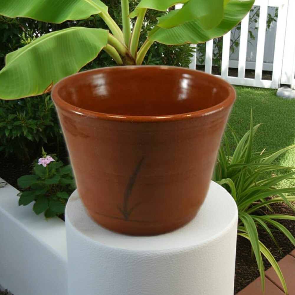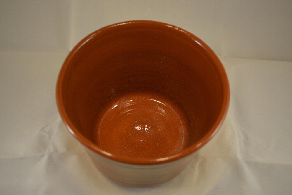 Bloempot gedraaid van roodbakkense klei. Transparant geglazuurd.