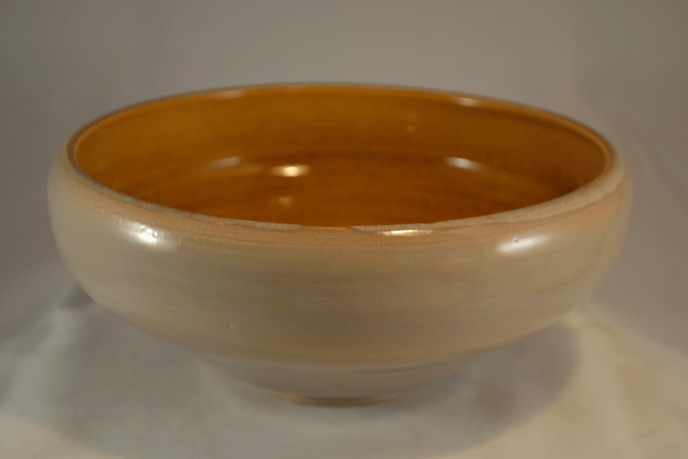 Schaal afgewerkt met glanzend bruin / beige glazuur.