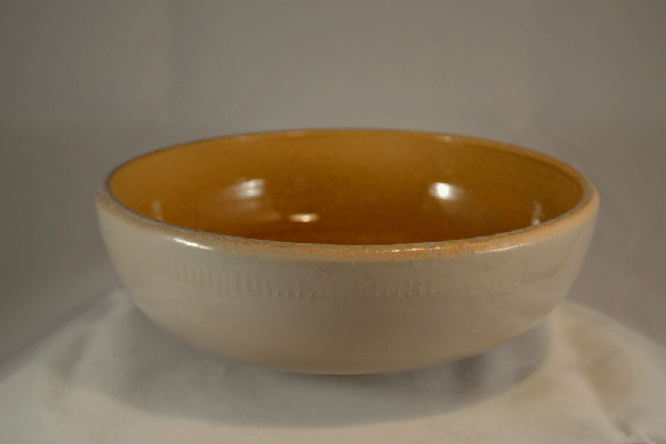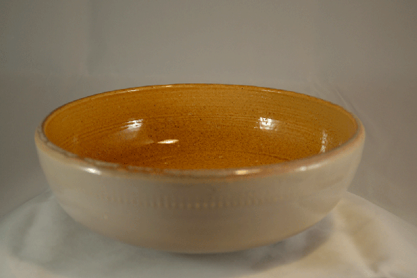 De schaal is afgewerkt met bruin / beige transparant glansglazuur