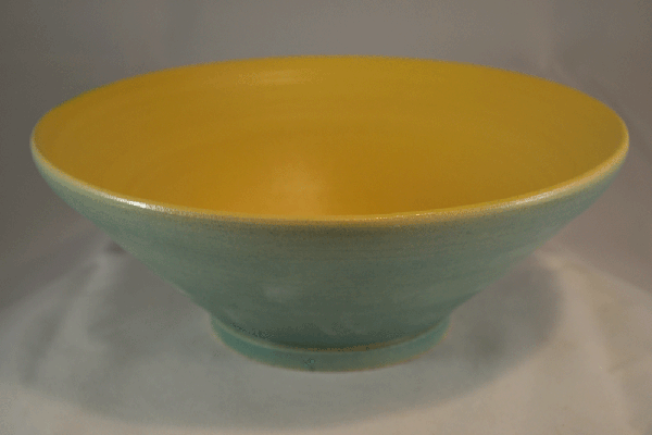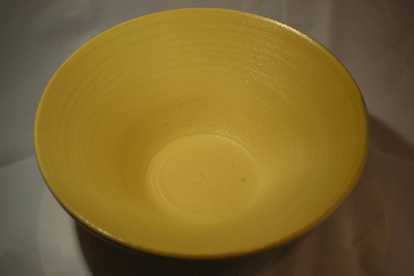 Deze schaal is bezet met dekkende zijdeglans glazuur.Aan de binnenkant is geel pigment aan het glazuur toegevoegd.Aan de buitenkant is koperoxide aan het glazuur toegevoegd.