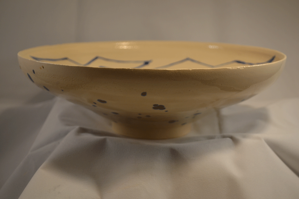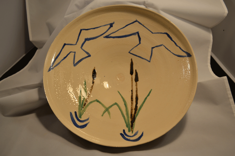 Schaal met de hand gedraaid en na het biscuitbakken De vogels en het riet zijn met de hand beschilderd mt onderglazuur. Aan de buitenkant zijn blauwe kristaalen aangebracht. Tot slot de binnenkant en de buitenkant met transparant glazuur afgewerkt.