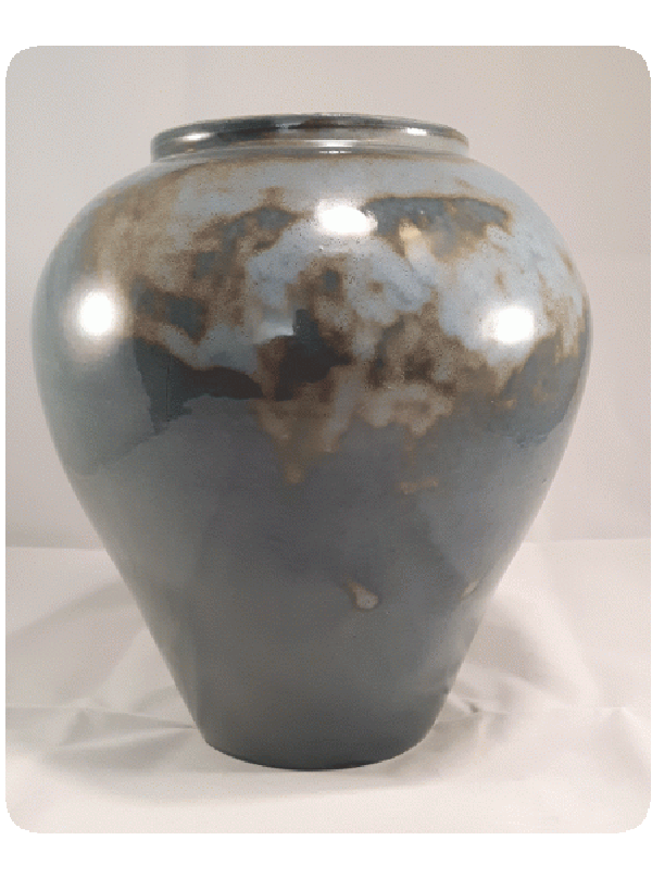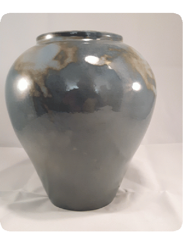 Vaas gedraaid van witbakkende klei. Geglazuurd met staalblauw effect glazuur.Hoogte 22 cm diameter 20,5 cm