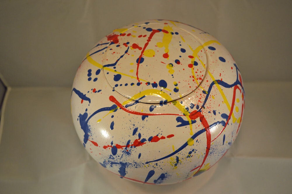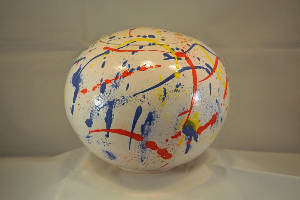 De urn is aan de buitenkant afgewerkt met witglazuur, waarop kleurlijnen en stippen is aangebracht.