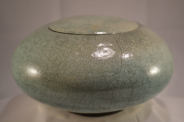 Ovale urn met deksel. Gedraaid van witbakkende klei. Afgewerkt met koperoxide glansglazuur.Geglazuurd in een raku-oven.Hoogte 14,5 cm diameter 25,5 cm inhoud 3 liter.