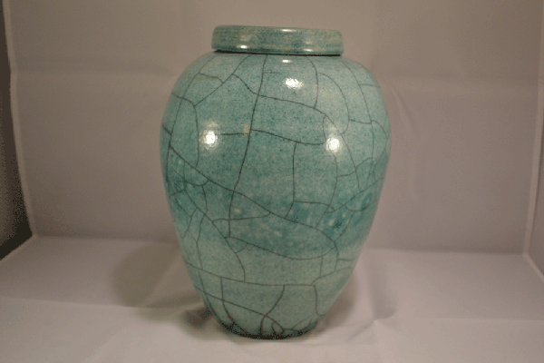 Vaas gdraaid van witbakkende klei. In de raku-oven geglazuurd met koperoxide.Hoogte 22 cm diameter 19,5 cm. Inhoud 3,4 liter.