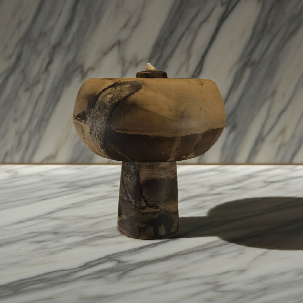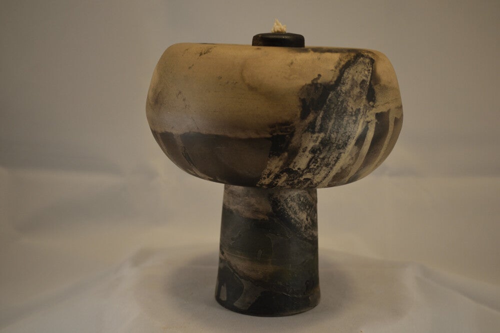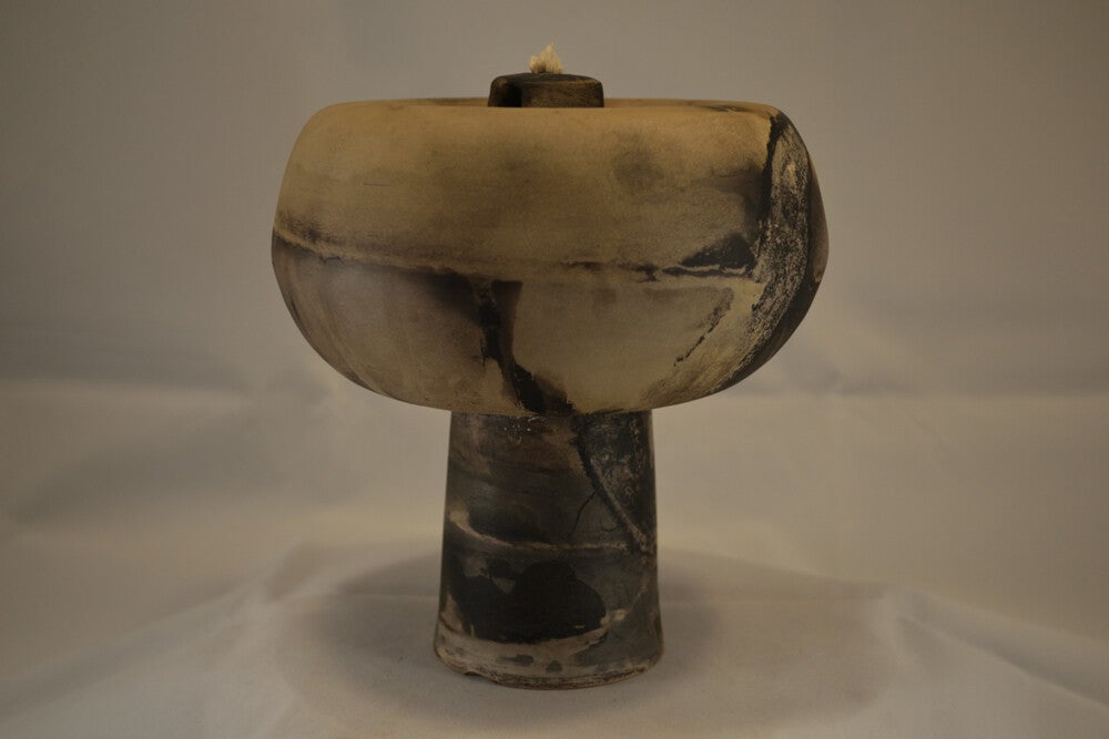 Deze olielamp is gemaakt van draaiklei. De lamp is steengoed gebakken. In dit geval 1150 °C. De klei is zover gekrompen dat deze nu ook waterdicht is.
