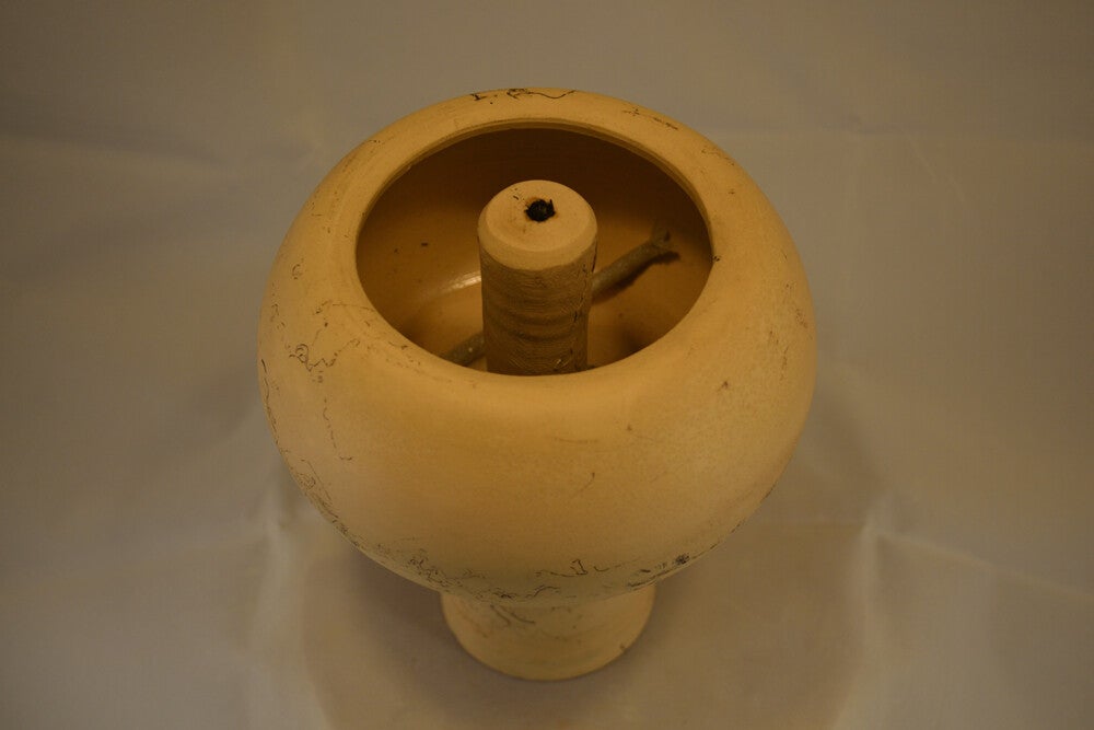 Deze olielamp is gemaakt van draaiklei. De lamp is steengoed gebakken. In dit geval 1150 °C. De klei is zover gekrompen dat deze nu ook waterdicht is.