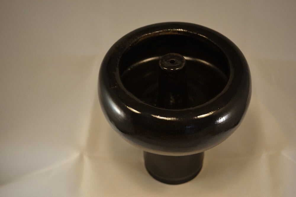 De olielamp is gedraaid met draaiklei. De lamp is steengoed gebakken 1150 °C. Daarna met zwart glansglazuur afgewerkt