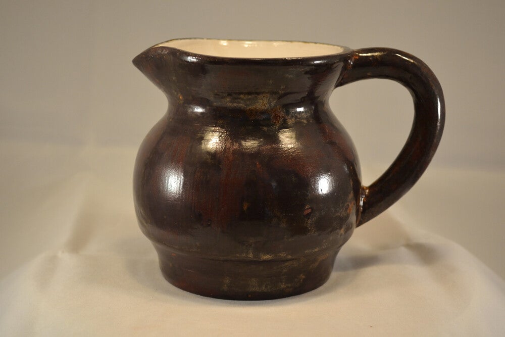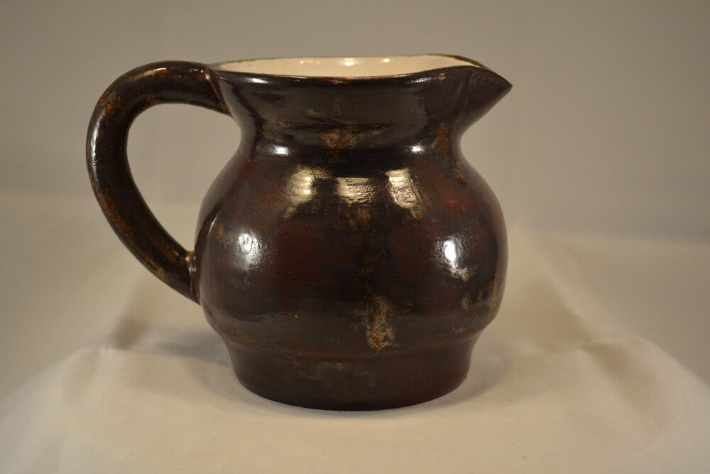 De schankkan is gedraaid van wit bakkende klei. De buitenkant is afgewerkt met gemeleerd glazuur. De binnenkant met witglazuur.