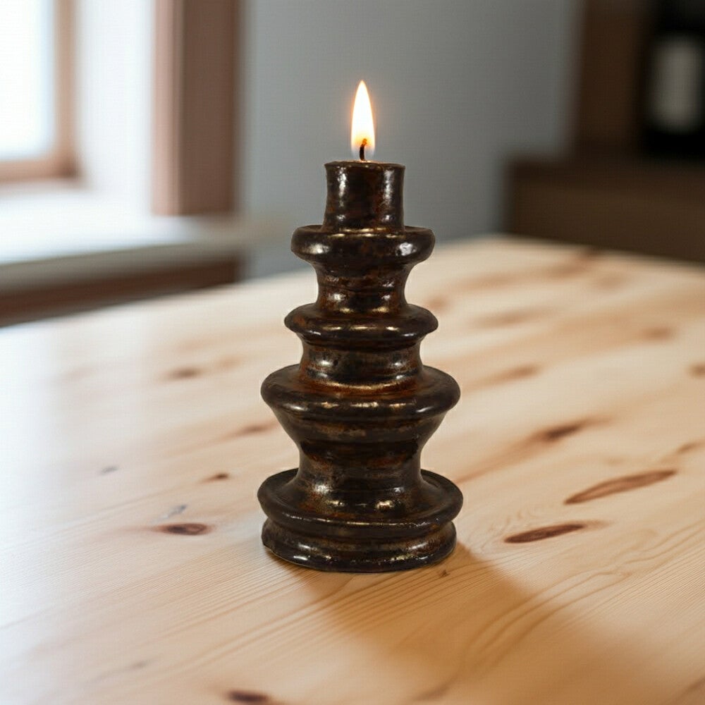 De kandelaar is gedraaid van witbakkende klei en afgewerkt met gemêleerd glazuur.